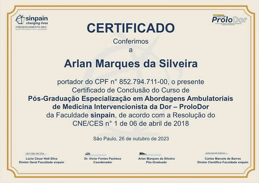 Com uma pós-graduação dedicada ao alívio da dor, o Dr. Arlan combina expertise em neurocirurgia com abordagens avançadas para proporcionar mais qualidade de vida aos seus pacientes.
